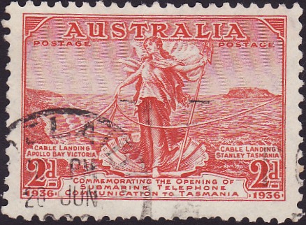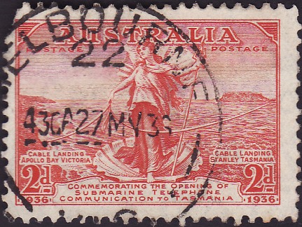 This design shows Amphitrite with cable spanning between the two shores (Tasmania & mainland Victoria), the 2d stamp has two types, A & B, Type A has a line joining the inner & outer frames to the right of the left 2d value, Type B does not have this line, apart from this both are identical.