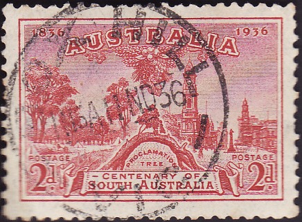 The design shows the Proclamation Tree, (Old Gum Tree) at Glenelg, Adelaide where the proclamation of the City was read on December, 28, 1836.